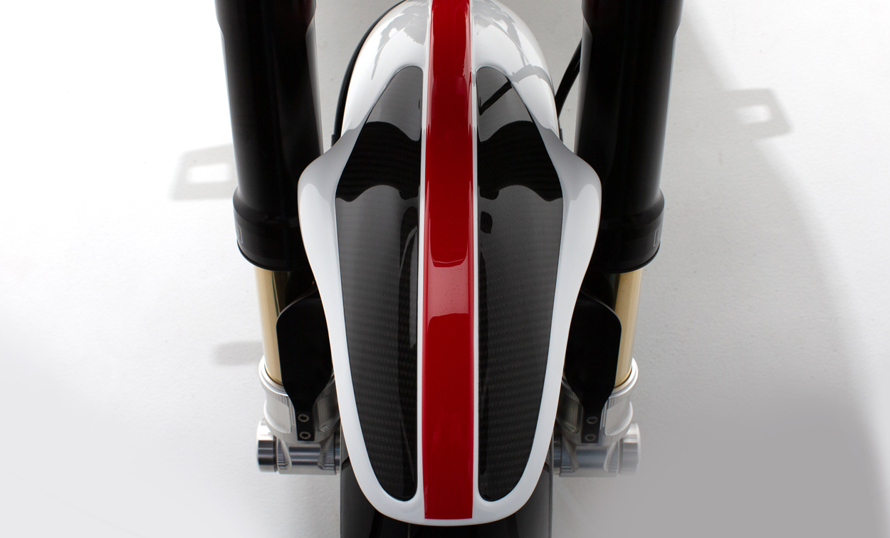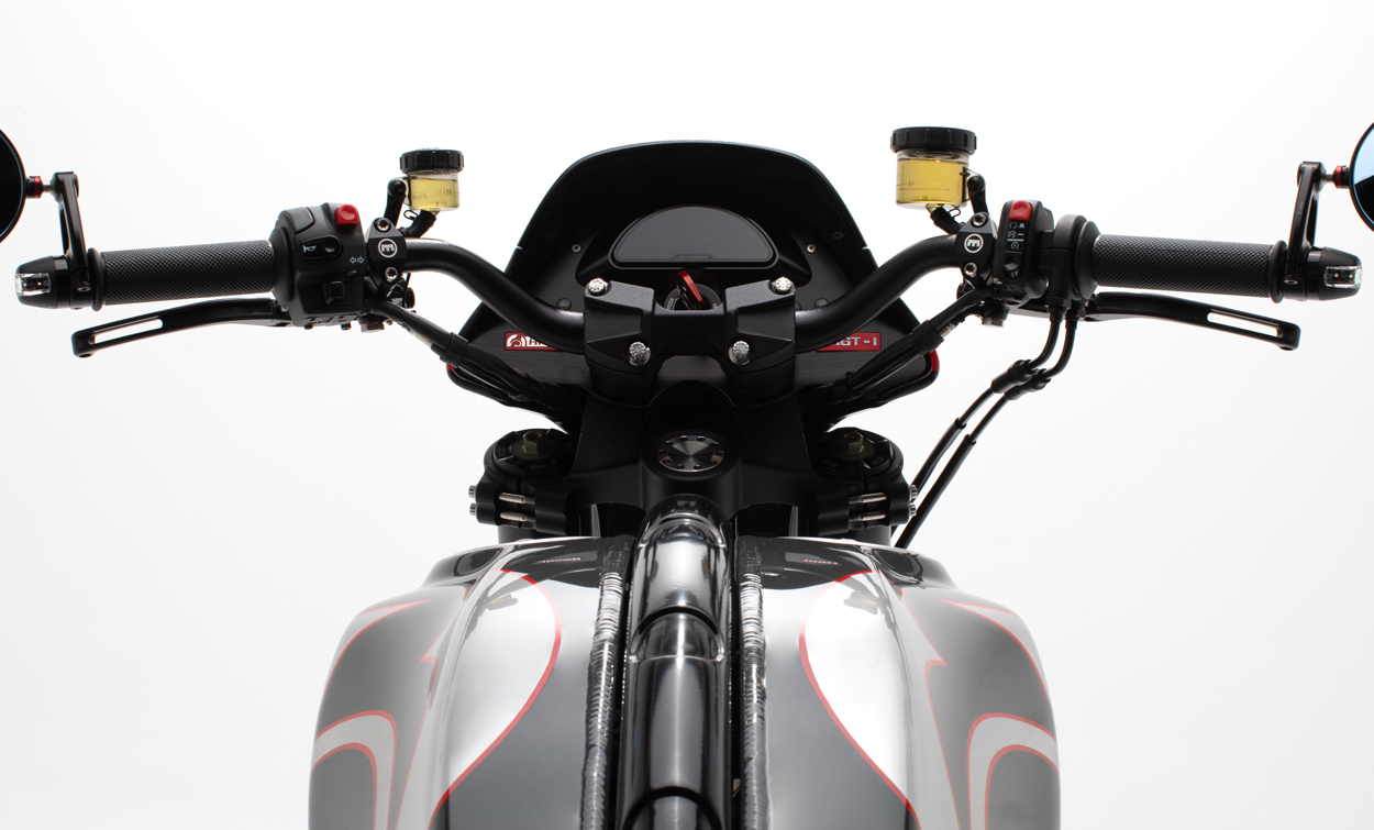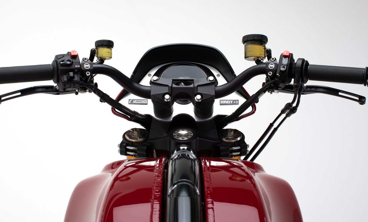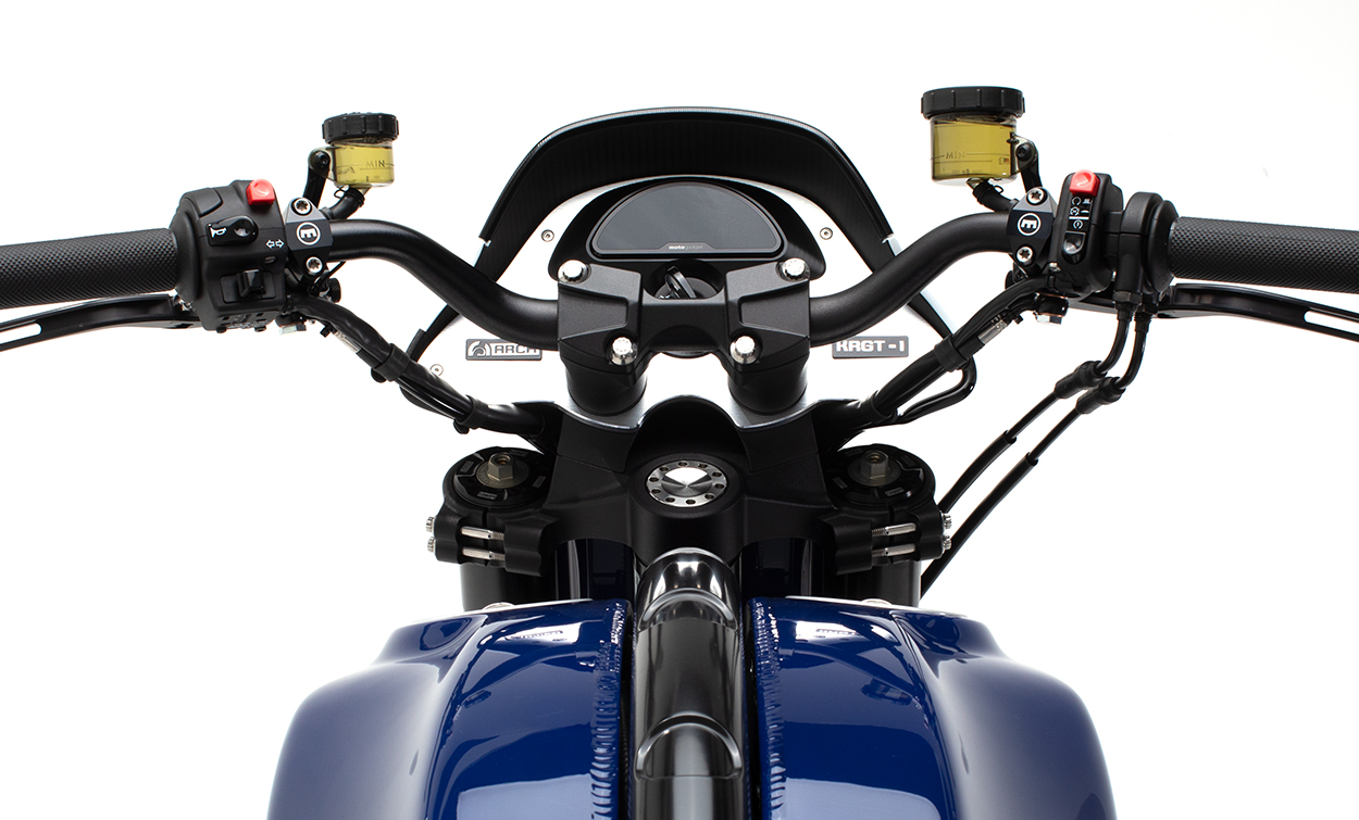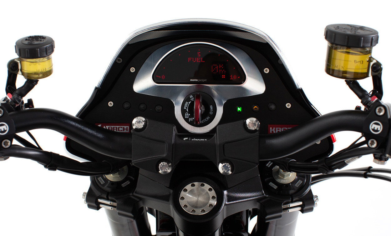 The ARCH KRGT-1 is defined by its agile yet planted handling characteristics. Billet aluminum components designed to serve multiple functions are employed to provide a rigid and more dynamic ride. The single-tube backbone frame is complemented by a machined billet aluminum fuel cell that acts as a stressed member and completes the chassis. A lightweight billet aluminum swingarm structure reduces unsprung weight allowing the rider to feel more connected with the road.