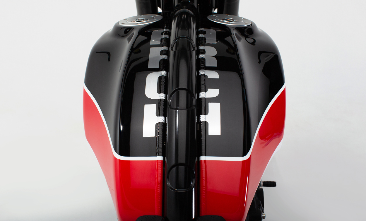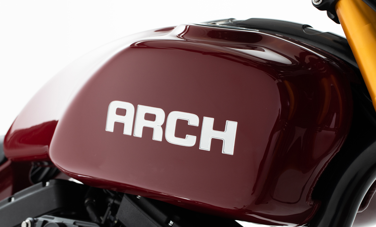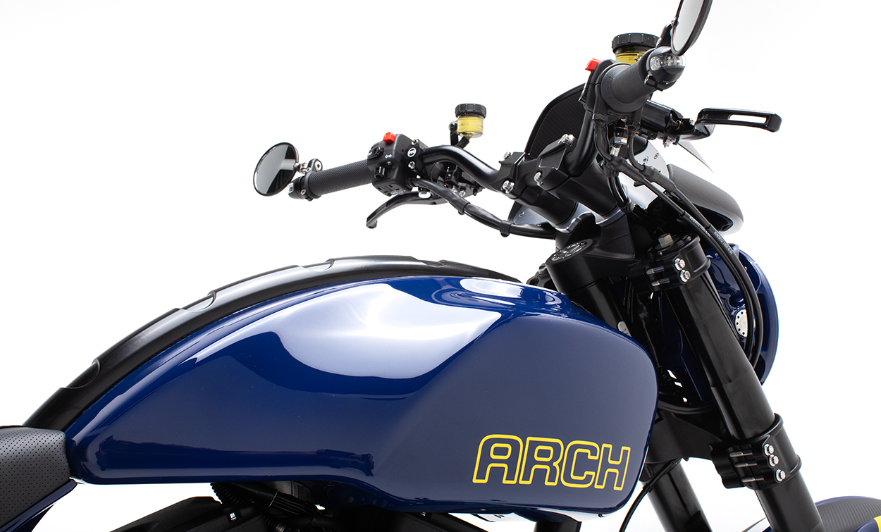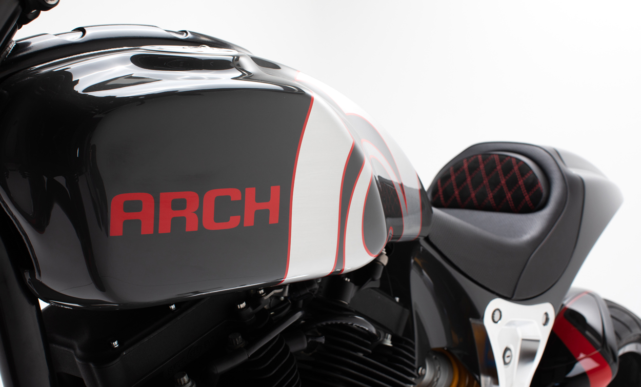 The ARCH Performance Architecture features a steel tube main frame with billet aluminum subframe to provide a rigid chassis structure for dynamic handling. Drivetrain isolation dampeners have been incorporated to help reduce vibration. Components are manufactured in-house starting with 1,200 pounds of billet aluminum. The end result yields approximately 120 pounds of unique components, from chassis side plates, fuel cells, and swingarm to engine covers and more. When outside products are needed, we partner with top manufacturers to create functional components that enhance the riding experience.
