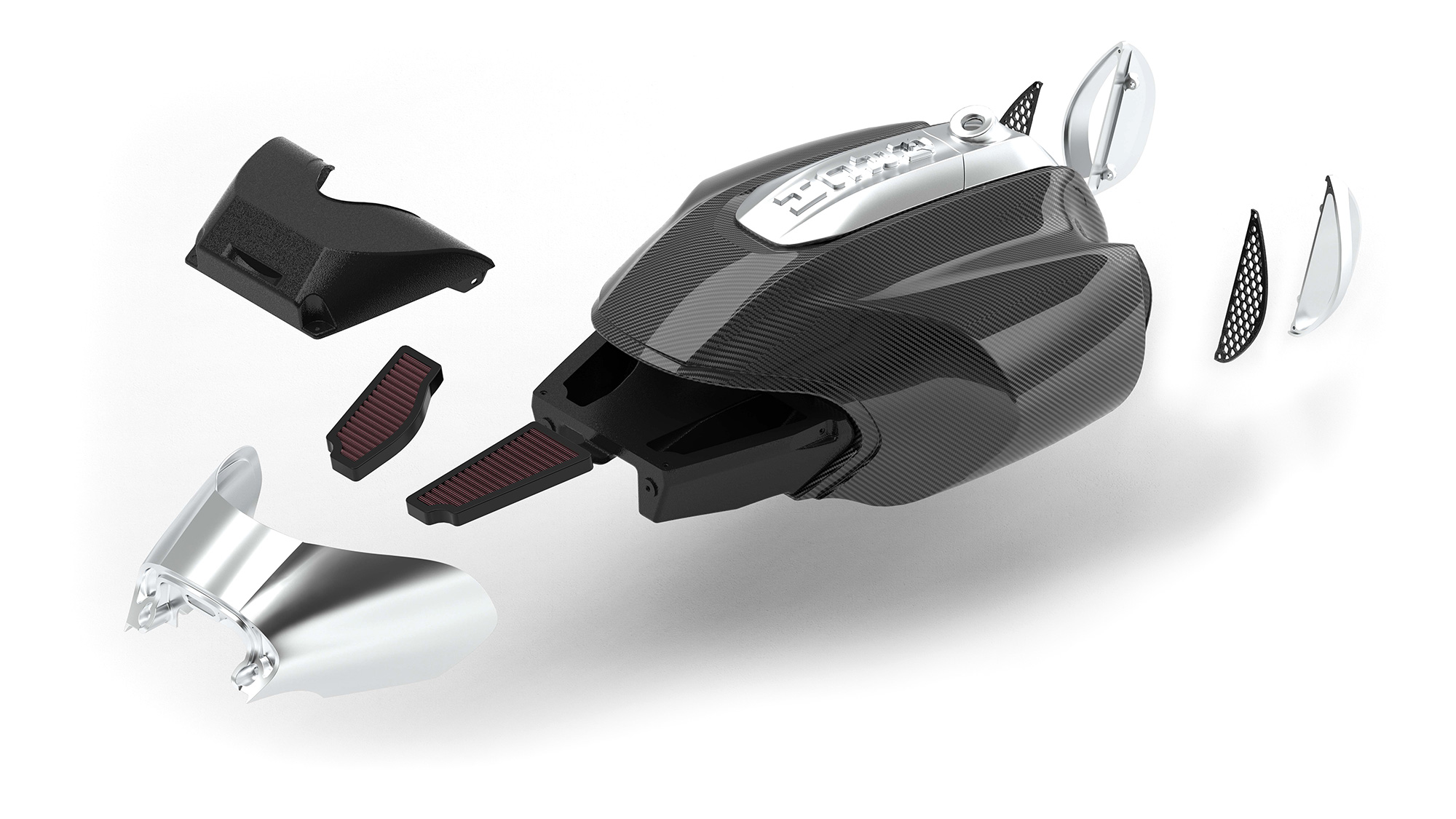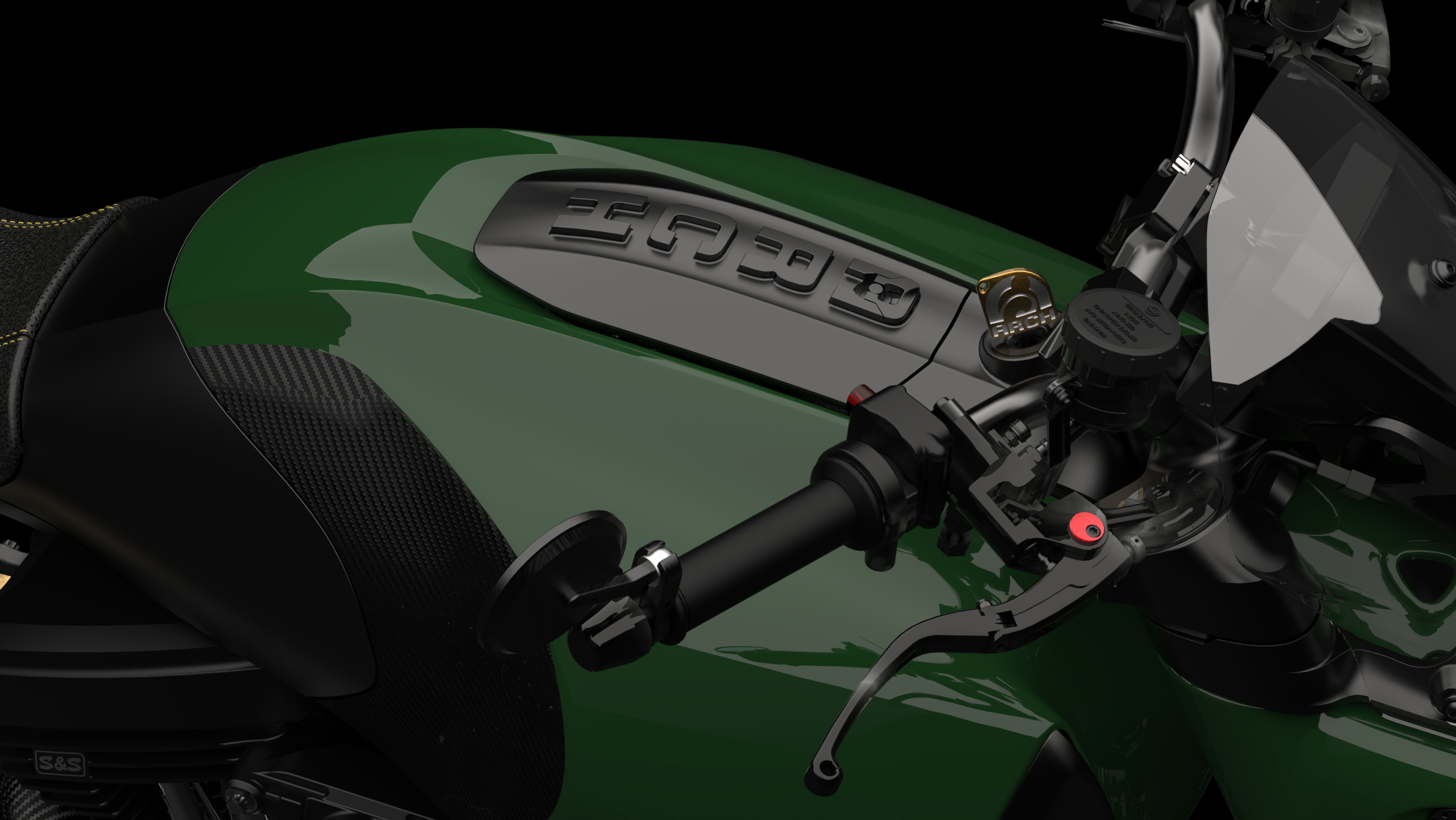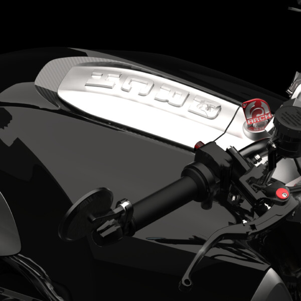 The ARCH 1s utilizes a carbon fiber fuel cell with a built-in air intake and filtration system. Airflow is fed through side vents at the front of the carbon tank leading directly to the intake system housed at the rear of the tank. This location reduces the bulk of a side-mounted air filtration system and creates a streamlined riding position while delivering optimal intake flow.
