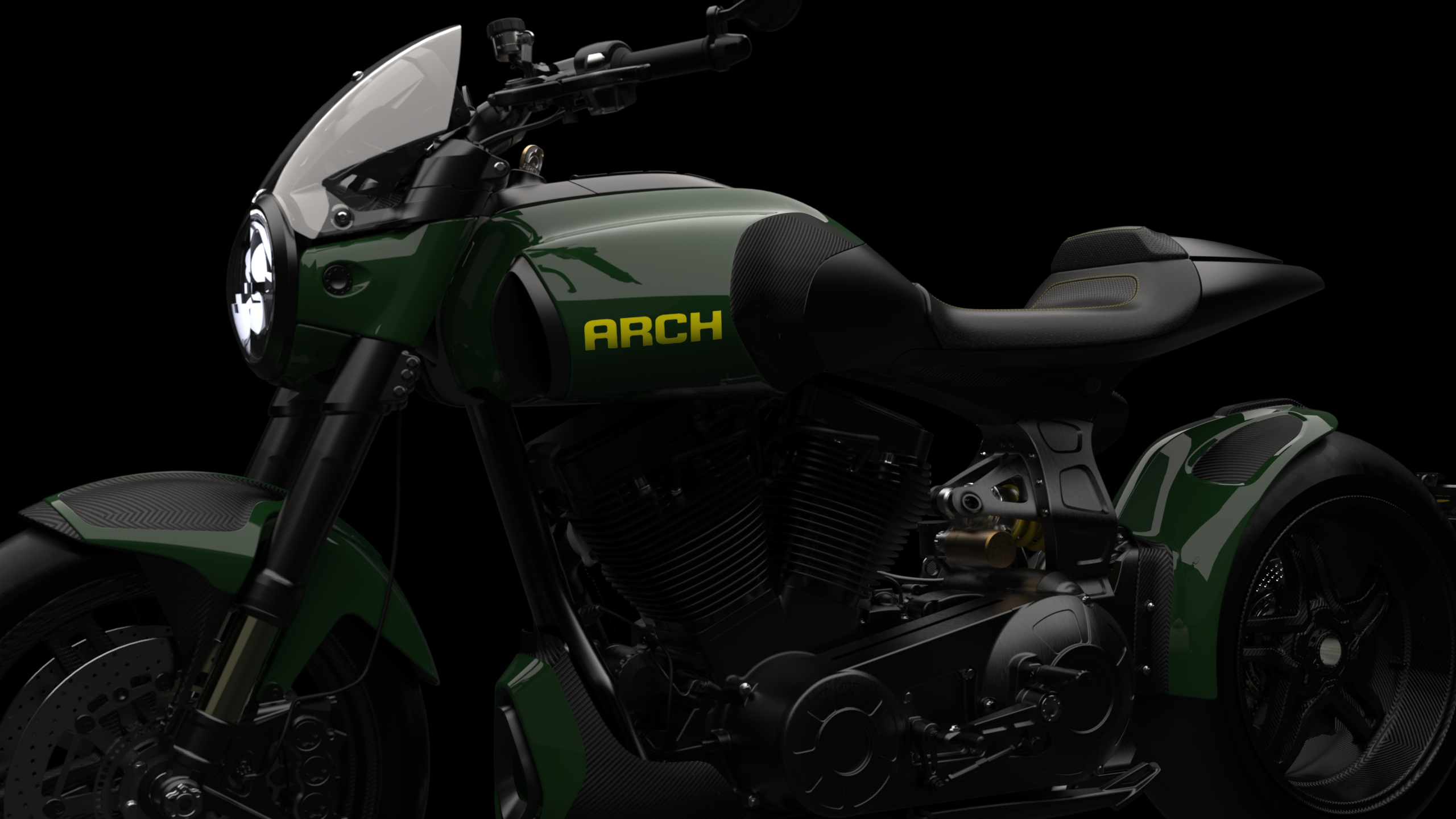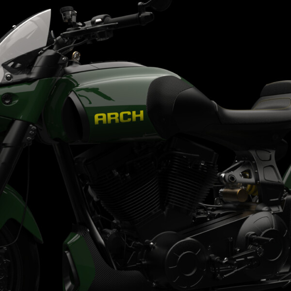 The ARCH 1s draws influence from both cruiser and street sport riding to create a motorcycle that defies industry categorization. The 1s features the first production single-sided billet aluminum swingarm from ARCH. Rear/mid-mounted foot controls provide a more aggressive riding position.