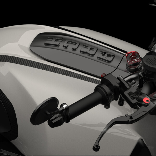 The ARCH 1s fuel cell is accessed through a cleverly hidden gas cap integrated into a hinged billet aluminum machined panel. With a turn of the flip-up latch the fuel cover opens providing easy access for refueling.